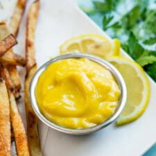 This tangy lemon aioli sauce is great for dipping fries, vegetables or using as a sandwich spread! Here are two methods for how to make it.