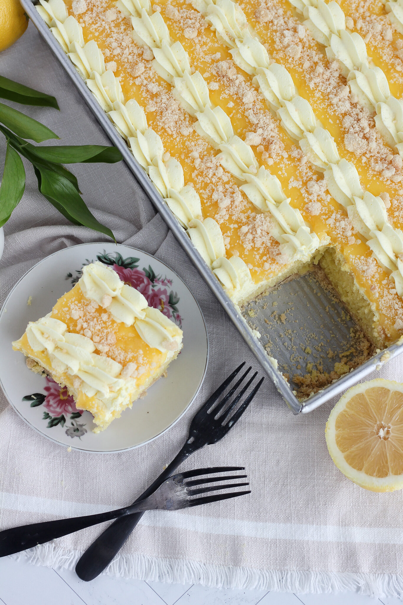 A Luscious Lemon Bar Sheet Cake with a zesty homemade Lemon Curd, Shortbread Crust on bottom, and a tasty lemon buttercream.