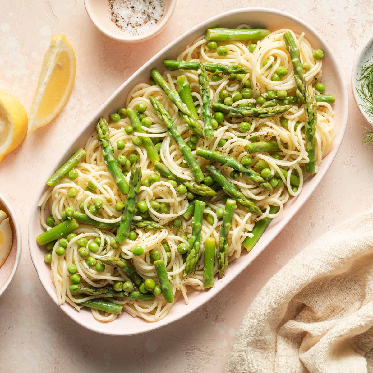 Lemon Garlic Pasta is quick and easy with fresh dill, peas and asparagus. There’s no butter or cream and it takes just 25 minutes to make!