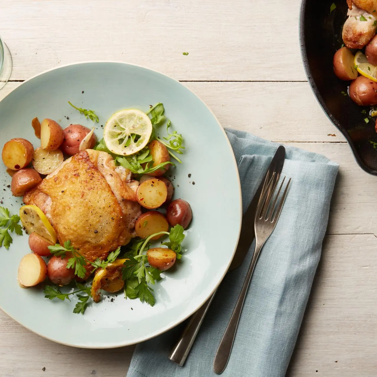 Reduce the heat to medium and flip the chicken over. Scatter the potatoes, then lemon and then the garlic around the chicken. Add 1 cup water, red pepper flakes and 1/2 teaspoon salt. Cover and cook until the potatoes can be pierced easily with a fork, 8 to 10 minutes. Remove the lid and continue to cook until the liquid has evaporated, an instant read thermometer inserted into the thickest part of the chicken reaches 165 degrees F and the potatoes start to crisp from the remaining fat in the pan, 8 to 10 minutes. Sprinkle with parsley.