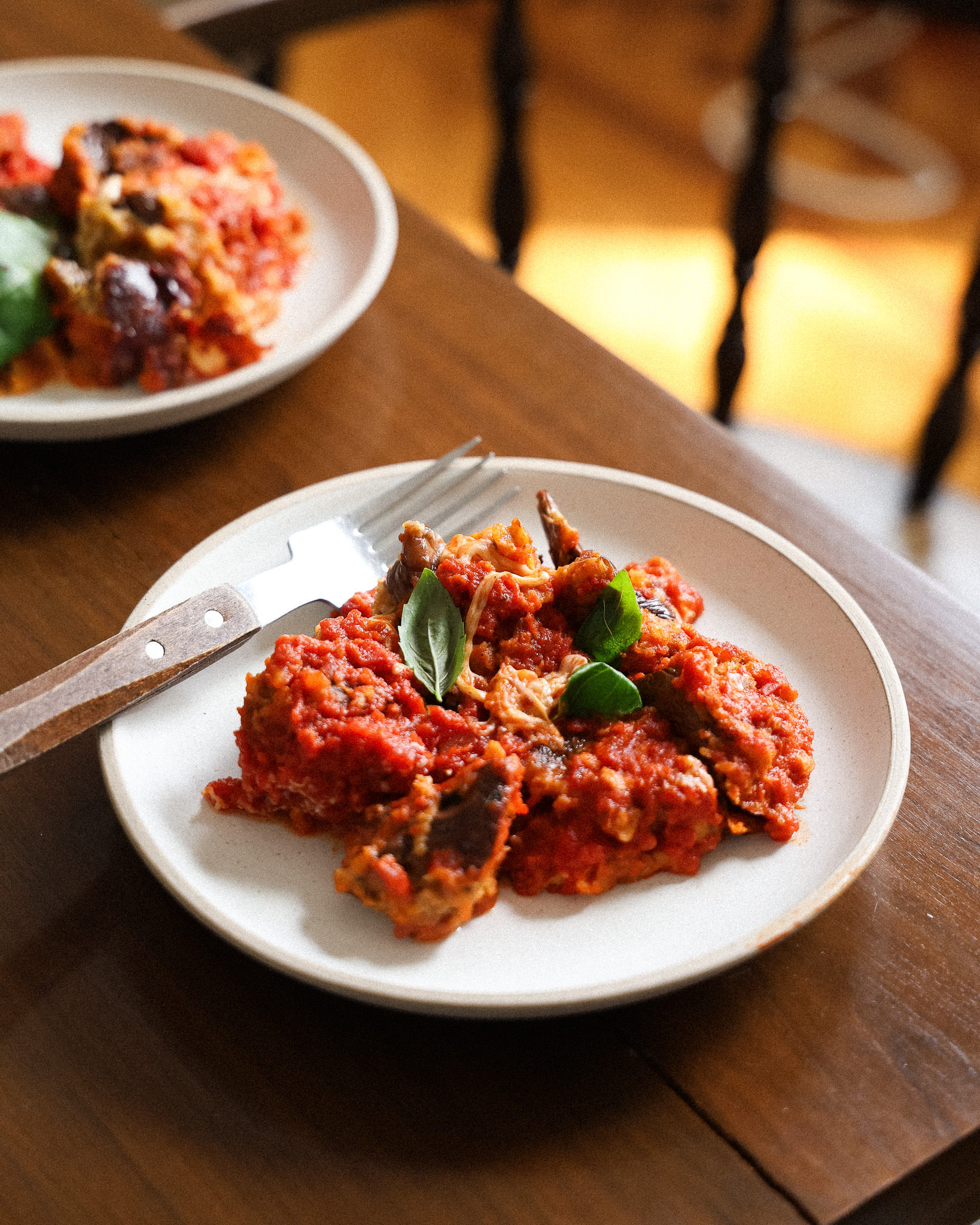 I usually hate using the term "lightened up" but here it really does speak volumes. This baked eggplant parmesan eats a little lighter, AND it is lighter on work. You still get all the delicious flavor and texture of a breaded and fried eggplant, but we're skipping the frying for a fast baking method, then adding everything to the oven to get all bubbly and melty. Half traditional, half easy, and fully delicious.