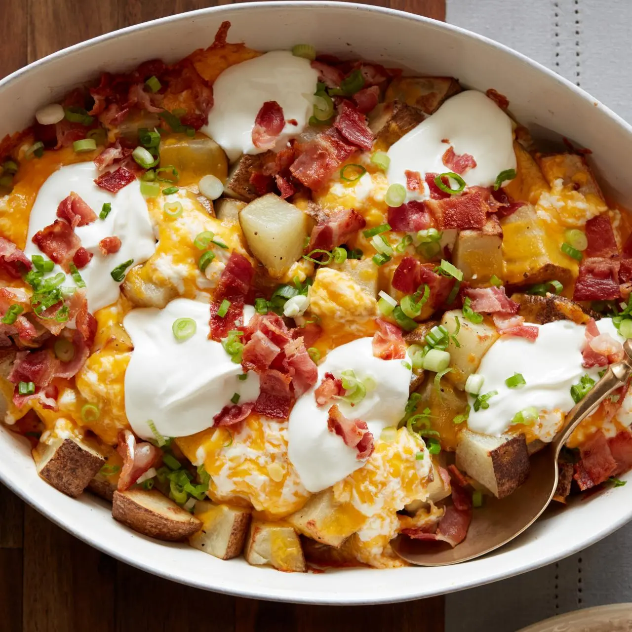 This casserole combines all the irresistible features of a loaded spud, but is cooked and served family style for an extra-hearty side.