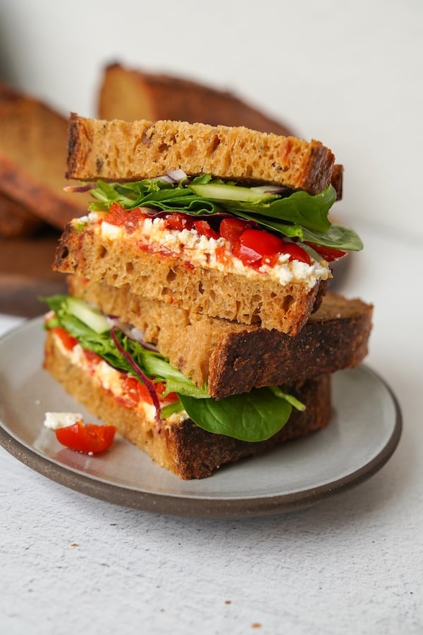 This Mediterranean Veggie Sourdough Sandwich is my favorite sandwich of all time. For real. The sweet piquante peppers are non-negotiable, so don't skip them!! Serve it on homemade tomato basil sourdough bread and you'll die and go to heaven.