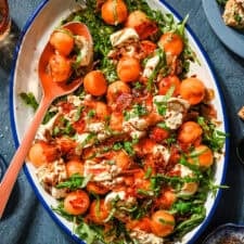 This melon and prosciutto salad with burrata and basil is the perfect blend of salty and sweet.