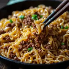 To finish, sprinkle sliced green onions over the noodles for a fresh and vibrant garnish. Serve the Mongolian Ground Beef Noodles hot and enjoy every satisfying bite!