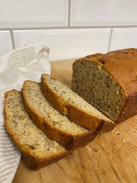 This banana bread is just like Grandma's - moist and full of flavor. Made with nuts and plenty of ripe bananas, it tastes delicious with butter or on its own.