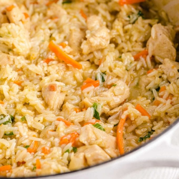 Add hot chicken broth then stir in rice. Bring to a boil, cover the pot, and reduce heat to low until the rice is fully cooked. This will take about 15 to 20 minutes.