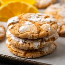 Soft and chewy orange crinkle cookies are coated in crackly powdered sugar and filled with sweet citrus flavor. Make the dough, roll it in sugar, and bake!