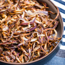 Take the onion from the bowl leaving behind the remaining liquid and spread it on a large stainless steel baking sheet, so it overlaps as little as possible.