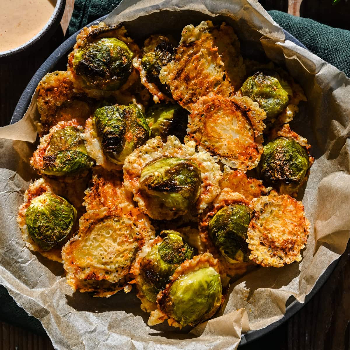 These parmesan crusted Brussels sprouts are the perfect side dish. Tender, crispy, and well-seasoned, they're perfect as a pairing for a steak, and are great for the holidays! We paired them with a hot honey mustard dipping sauce for even more flavor.