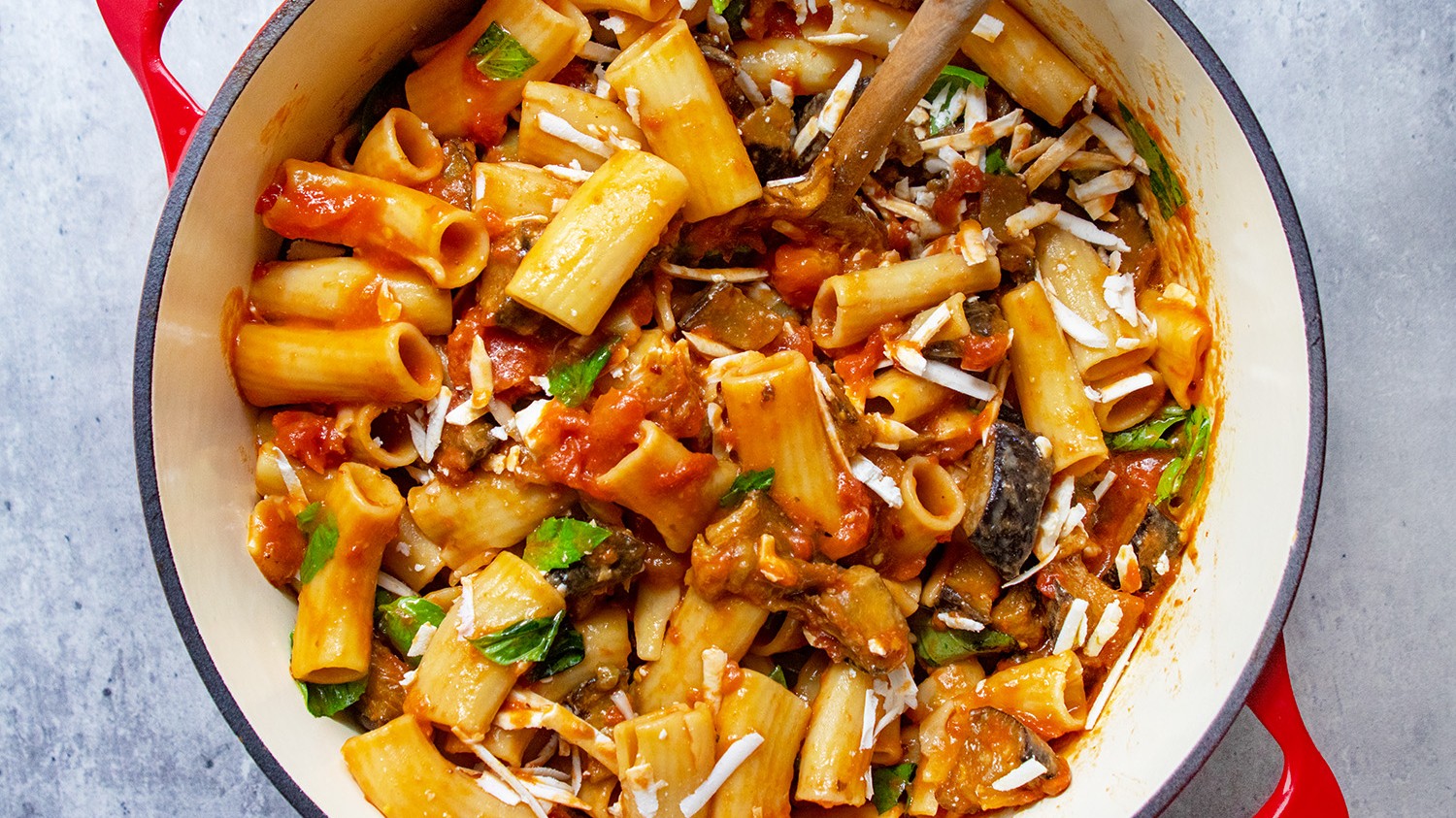 Bring a large pot of water to a boil. Season the boiling water generously with salt and add the pasta. Cook the pasta for 1 minute less than package directions about 11 minutes. Using a pasta spider or strainer, scoop the pasta directly from the water into the tomato sauce. Add 1/2 cup of pasta water to the pan. Sprinkle the parmesan cheese directly on the bare pasta. Toss well to coat. Simmer the pasta in the sauce over medium heat until al dente adding another 1/4 cup of pasta water if needed. This will take another 2 to 3 minutes. Toss in the roasted eggplant and the basil. Serve sprinkled with grated ricotta salata and a drizzle of olive oil if desired.