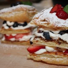 Set down a base piece of pastry. Use a pastry bag (or a ziplock with the tip cut off) to pipe a nice heavy layer of whipped cream. Spoon on an even layer of berries. Use a little more cream to stick on the next piece of pastry. Repeat.
