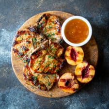 During the last minute of cooking, brush peach bourbon glaze all over pork chops.  Serve pork chops with extra glaze and grilled peaches.  Devour immediately!