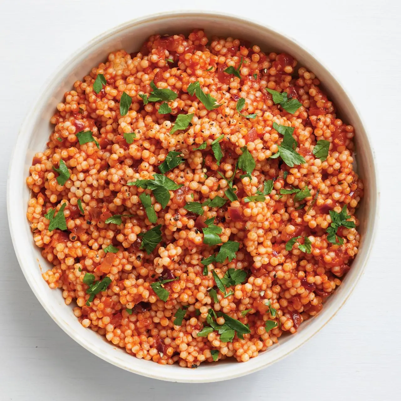 Cook 1 1/2 cups pearl couscous in boiling salted water, 4 to 5 minutes; drain. Cook 1 small diced red onion, 3 chopped garlic cloves and 1 teaspoon chopped rosemary in olive oil in a large skillet over medium-high heat until softened, 4 minutes. Add 1 cup packaged strained tomatoes, 1/4 cup water and 1/2 teaspoon kosher salt. Simmer until thick, 5 minutes. Stir in the couscous and 1 tablespoon chopped parsley; season with salt and pepper. Top with more parsley.