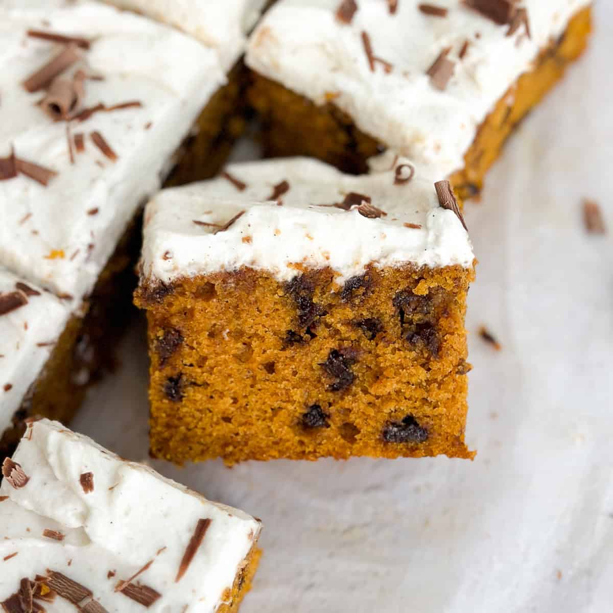 This pumpkin chocolate chip cake is a moist pumpkin spice cake loaded with chocolate chips and topped with a light and fluffy cream cheese whipped cream. It's quick and easy to throw together, and perfect for a fall treat!