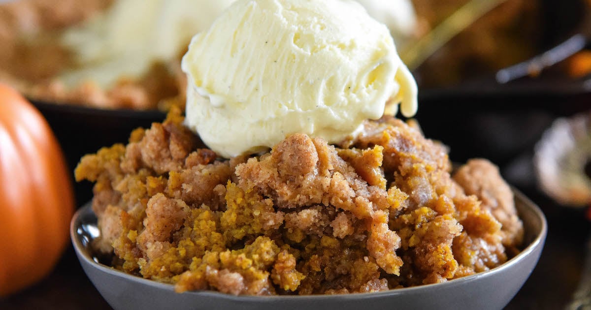 This is the original Pumpkin Crisp recipe, an easy fall dessert made with a creamy pumpkin pie filling and a golden cinnamon streusel crumb topping baked on top. Served warm with ice cream, it will be your new favorite way to enjoy pumpkin pie!