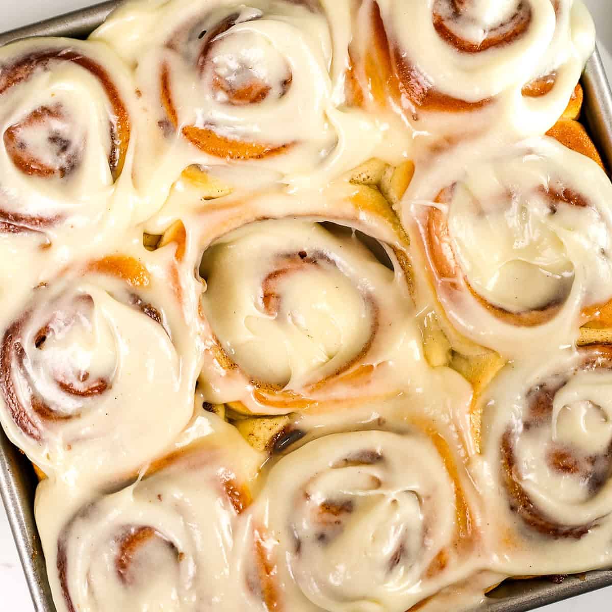 Let the cinnamon rolls cool for about 10 minutes, then spoon the frosting over each cinnamon roll and serve warm.