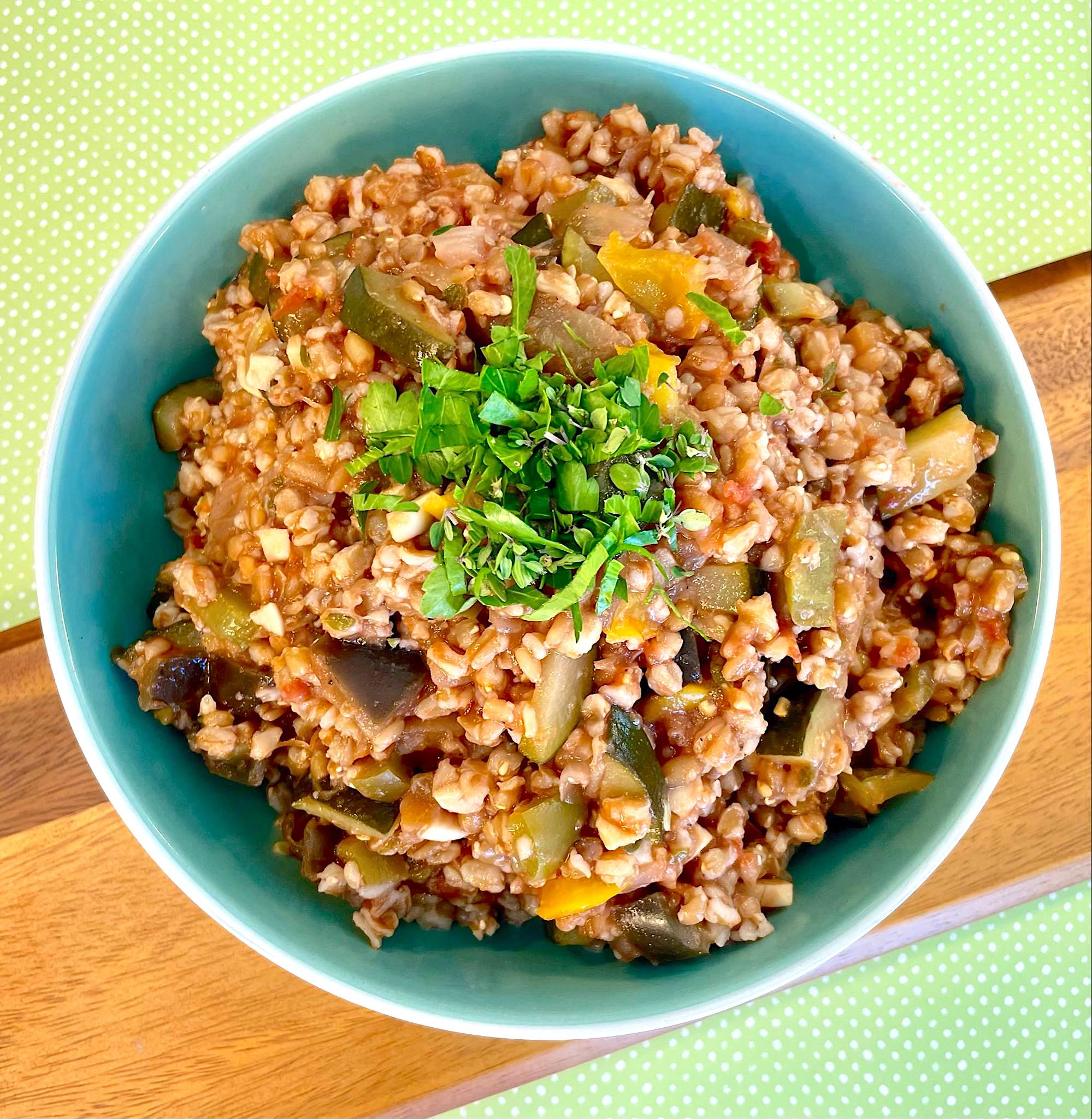 This hearty oil-fee, grain forward, dish was inspired by ratatouille, a classic Southern French summer vegetable stew. Farro adds a satisfying whole grain chewiness to the ratatouille flavor experience in this flexible recipe that also works with barley and other grains.
