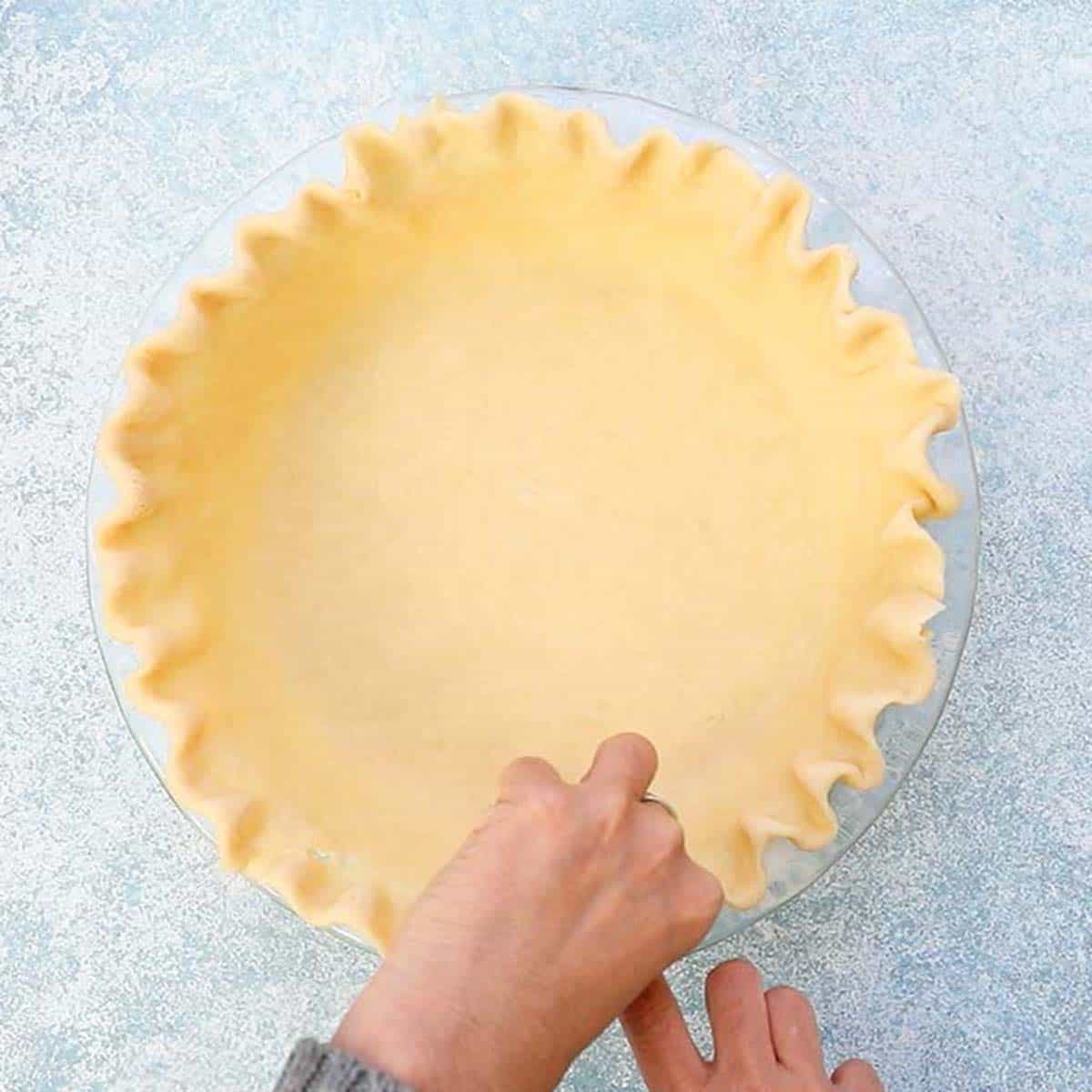 Trim any excess dough around the edges. To flute the edges, use a knuckle and 2 fingers to press around the edges of the pie crust, to give it a beautiful and classic scalloped look.You can also use a fork to crimp the edges for an easier approach.