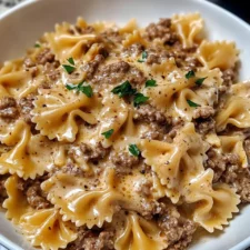 A rich and creamy pasta dish featuring ground beef, garlic, and Parmesan cheese, perfect for a comforting meal.