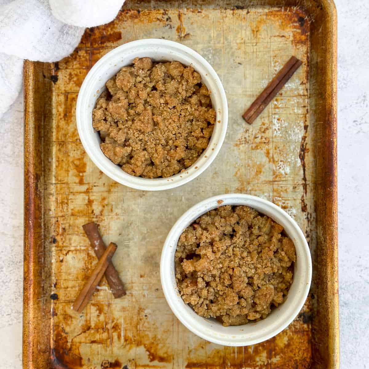This apple crumble for two is perfect when you have one apple and want to make a quick little dessert for two! It's filled with sweetly spiced apples and topped with a delicious buttery topping.