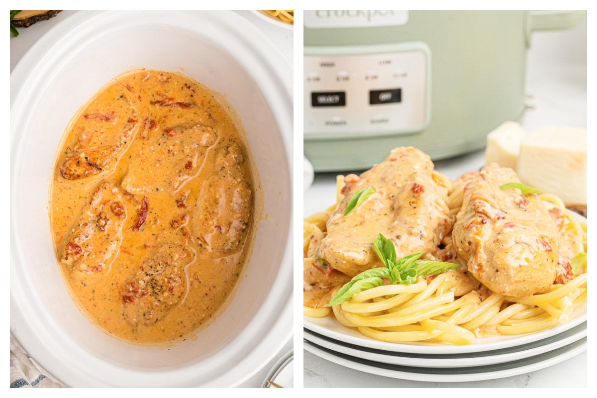 Place the browned chicken breasts into the slow cooker pot and top with the sun dried tomatoes and butter. Cover and cook on HIGH for 3 hours or LOW for 6 hours.
