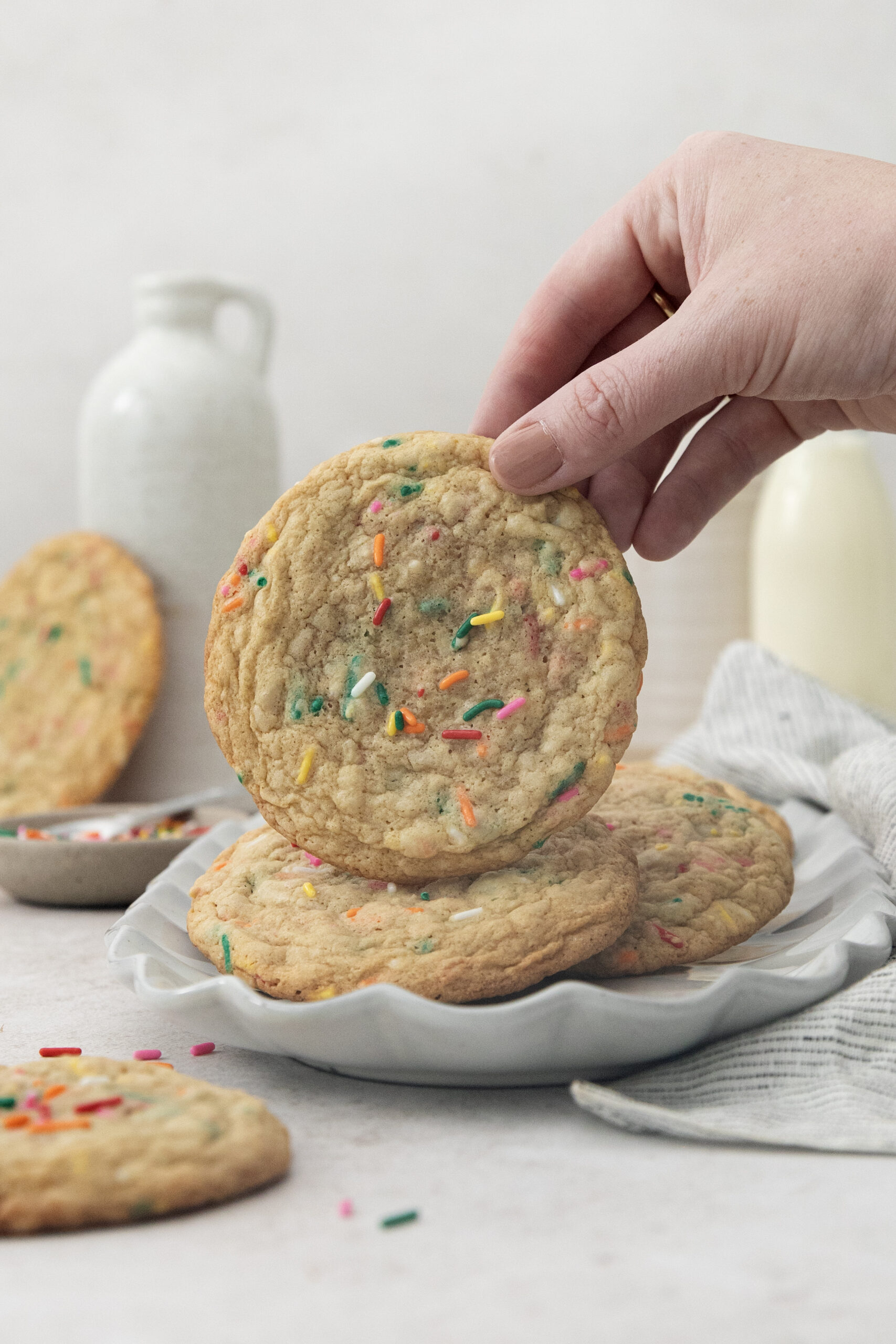 Pour in the dry ingredients and use a rubber spatula to fold and combine. Leave a few streaks of flour and fold the sprinkles in until just dispersed, don't overmix.