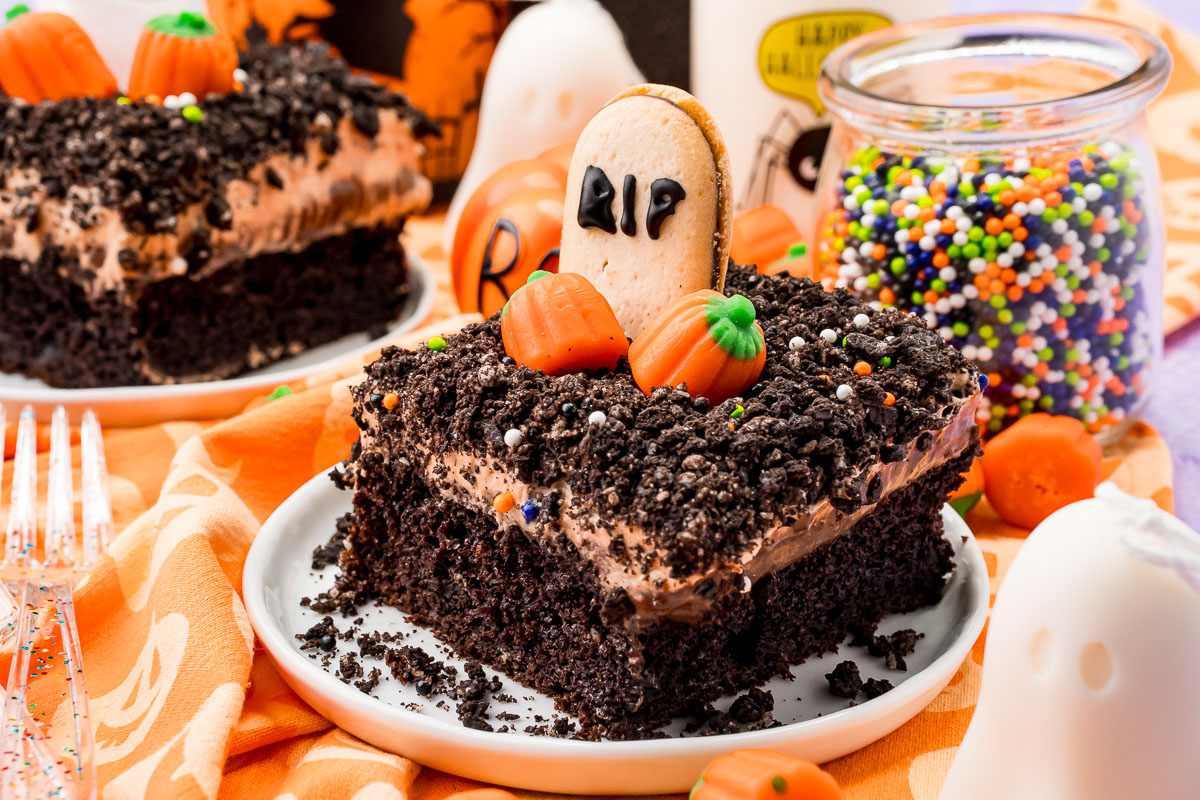 Halloween Dirt Cake layers chocolate pudding over a chocolate cake before being finished off with a 3-ingredient frosting and fun toppings! This festive cake will be an absolute hit at this year's Halloween Party!