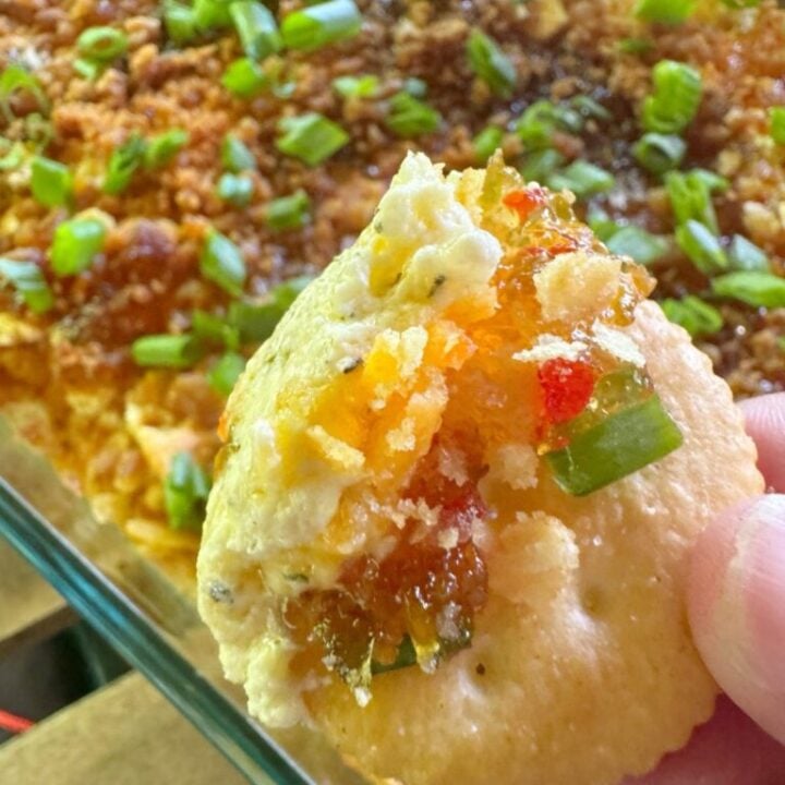 The World's Best Party Dip is made with baked cream cheese, cheddar, crunchy water chestnuts, red pepper, green onions and then baked until bubbly and delicious. topped with buttery crackers, pepper jelly and bacon. This dip is addicting. It will be the hit of every party that you bring it to.