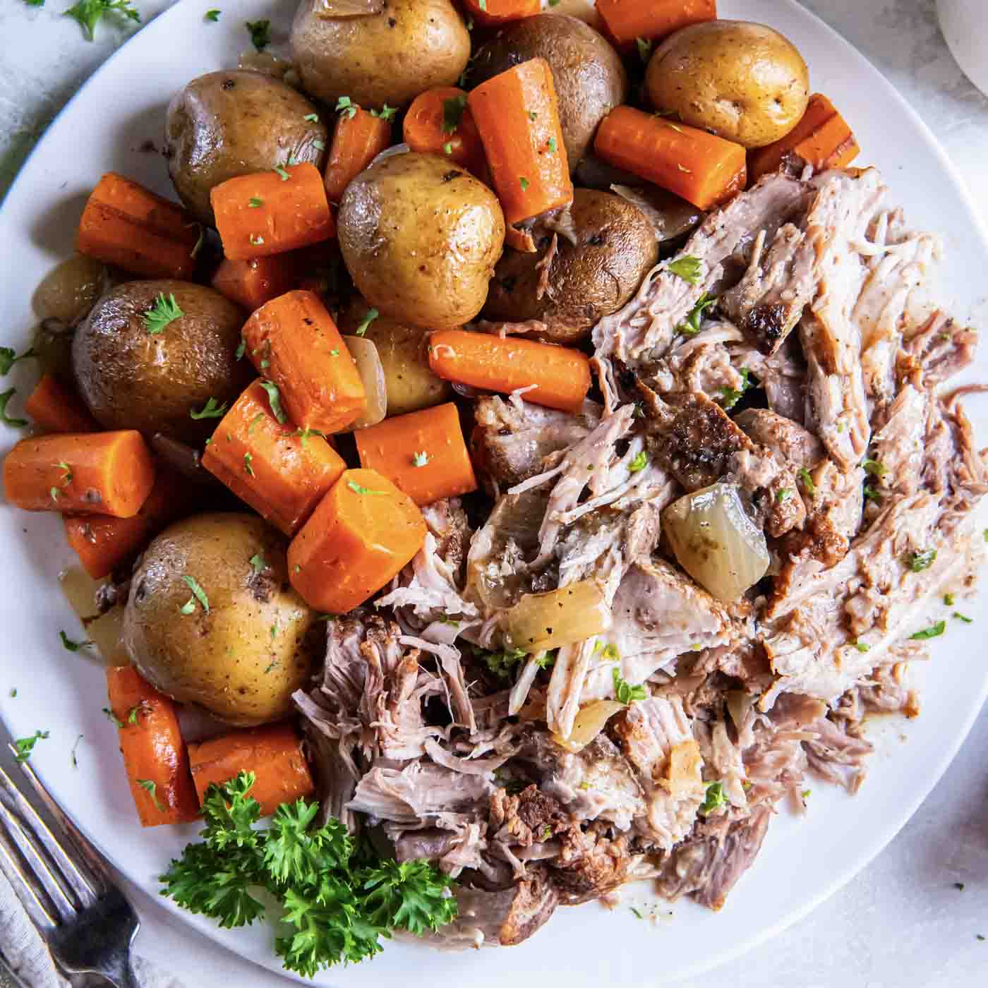 This easy crock pot pork roast recipe cooks all day in your slow cooker. With carrots, potatoes and fall-apart tender meat, it's a cozy, comforting meal that's perfect for Sunday dinner.