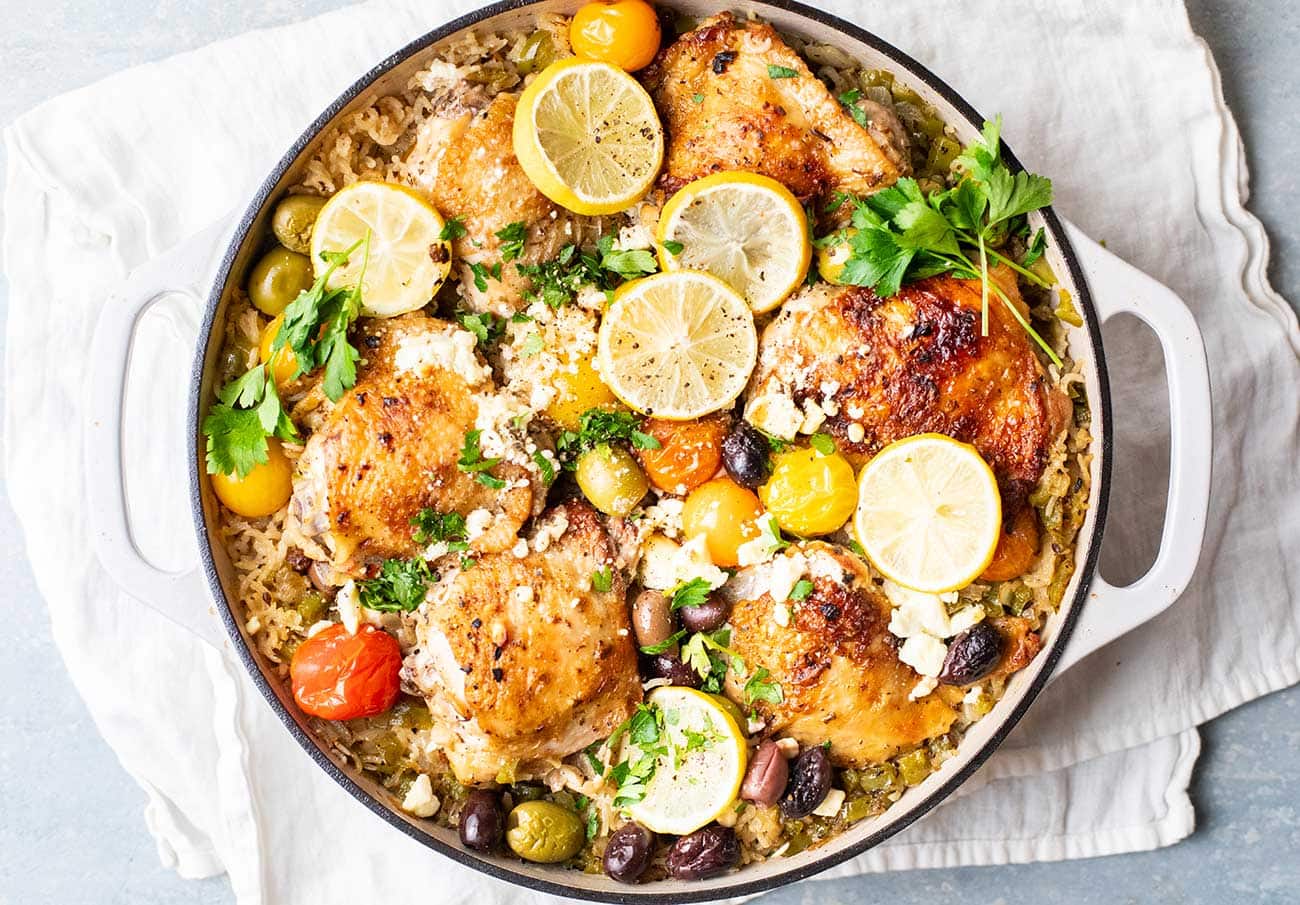 The perfect one-pan dinner! This Greek chicken and rice is bursting with fresh flavors. Once you've made it once, you'll realize how simple it is to make, and it uses mostly pantry and fridge staples.