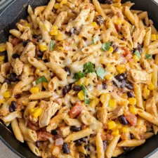 Southwest Chicken Pasta Skillet: Savor a spicy, creamy delight of chicken, pasta, black beans, and corn in this one-pan.