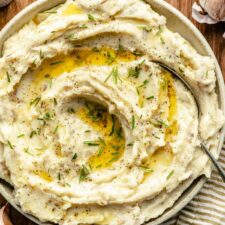 Add the butter and the remaining 3/4 cup coconut milk to the potatoes and continue to mash until smooth creamy. Add more milk if you want the potatoes to be creamier. This is also the time to add any cheese, sour cream, or Greek yogurt if you are using.