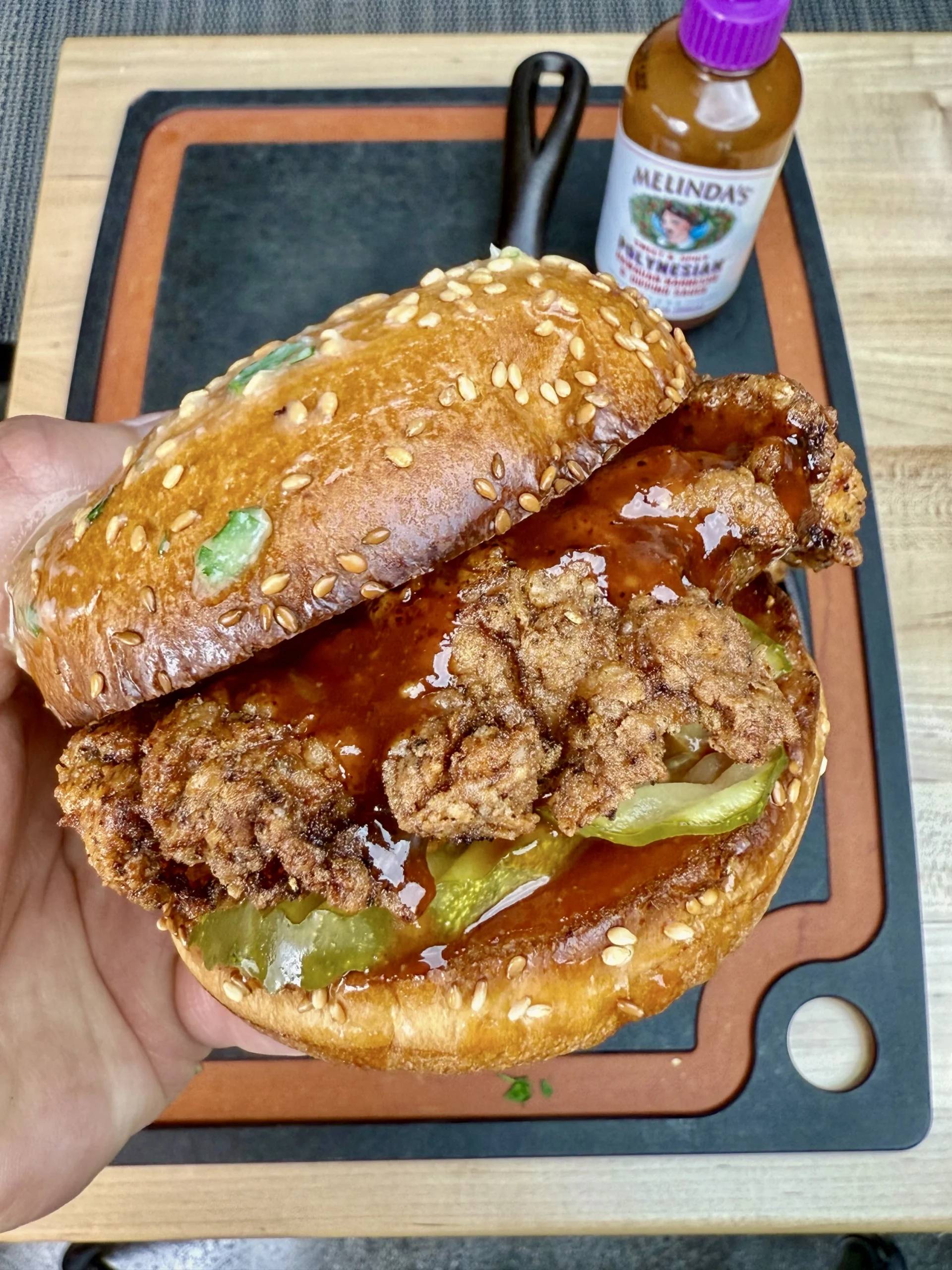 Crispy fried chicken thighs marinated in buttermilk and pickle juice, double-breaded for crunch, and glazed with Polynesian sauce. Served on toasted brioche with pineapple, slaw, and cheese.