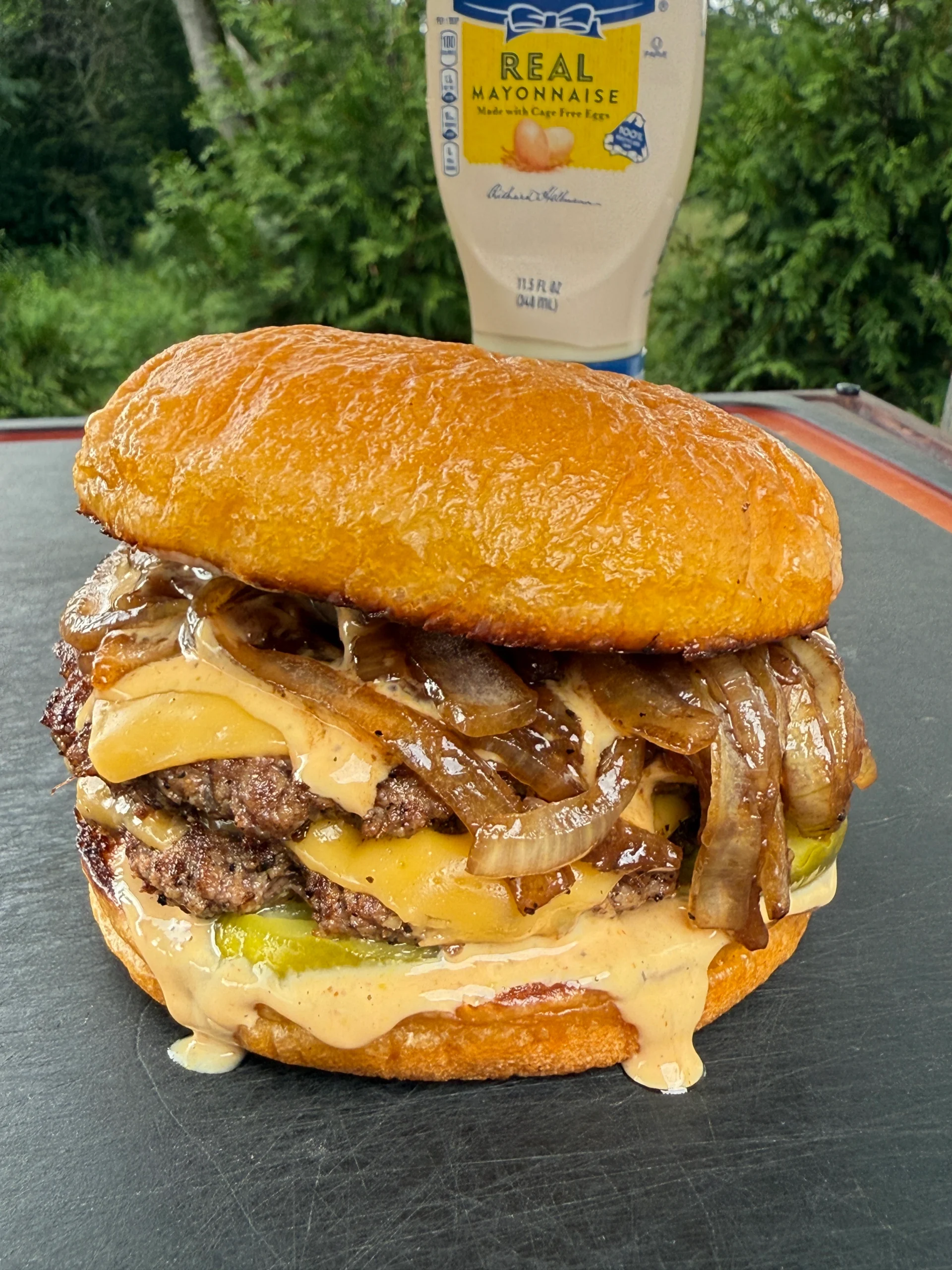 Assemble: pickles on bottom bun, add cheesy patty, caramelized onions, and burger sauce on top bun. Serve immediately.