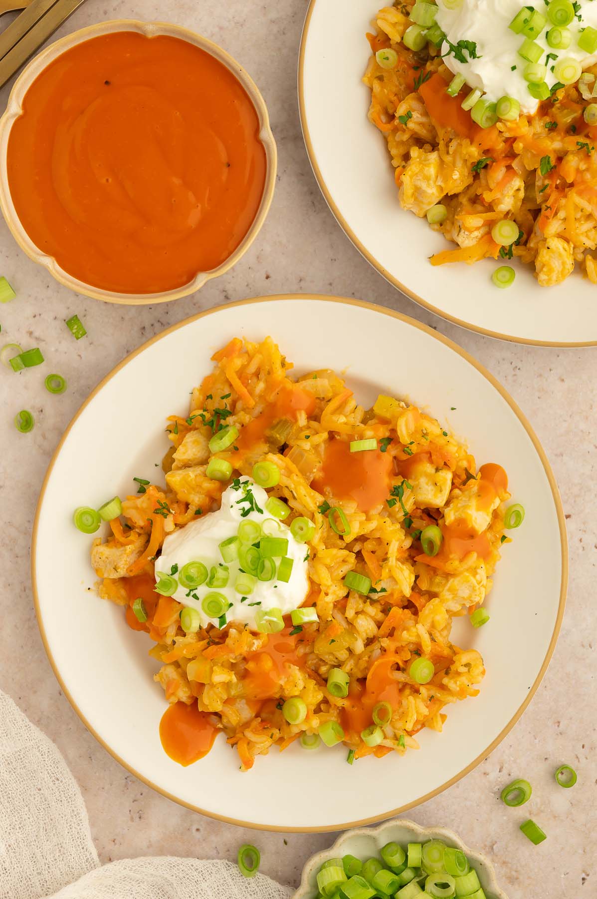 Buffalo Chicken and Rice is an easy one pot meal your whole family will love. Gluten free, high protein, delicious and done in under an hour!