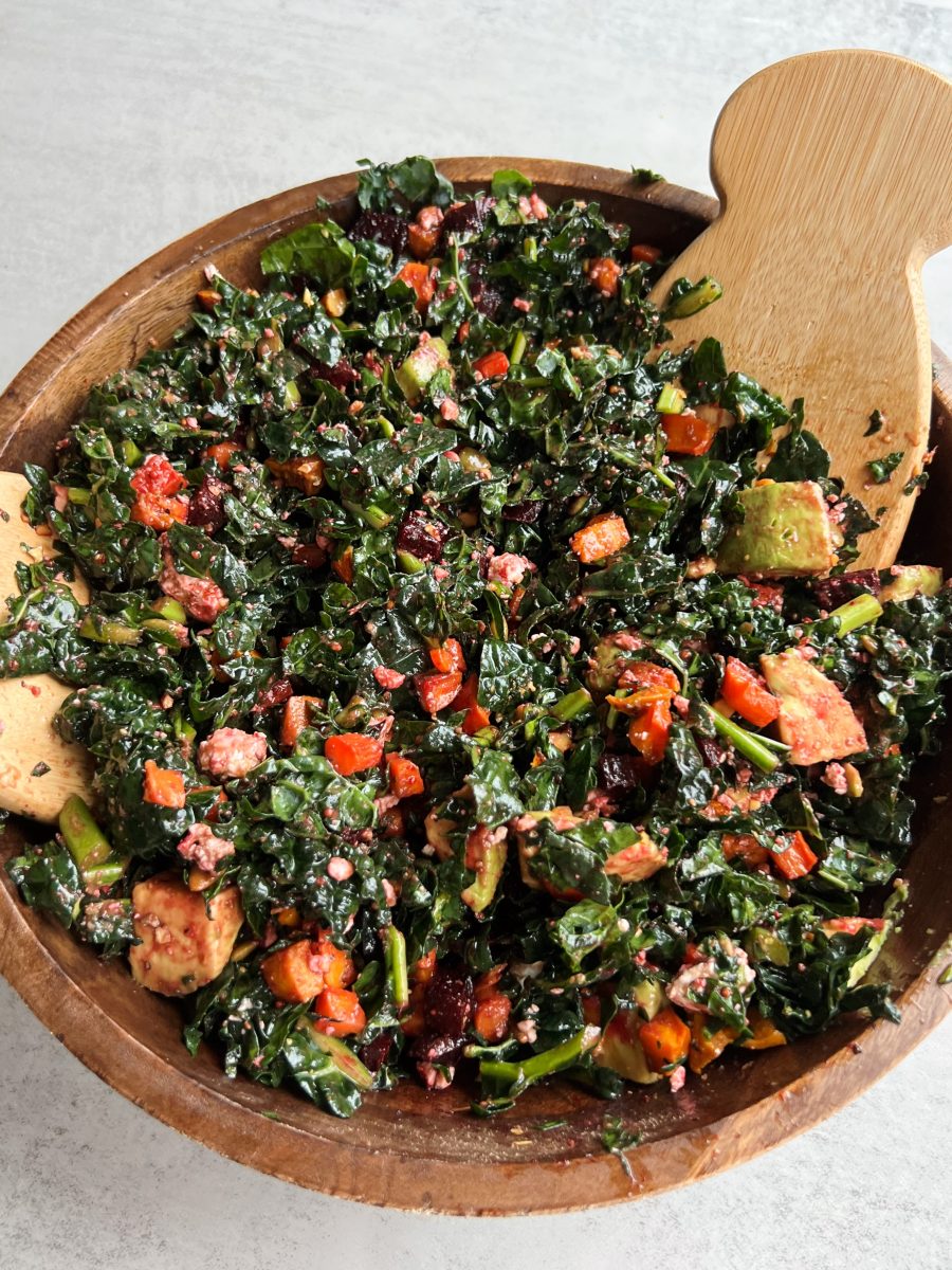 Cut up the avocado and add it to the kale along with the roasted veggies, nuts, seeds, and crumbled feta cheese