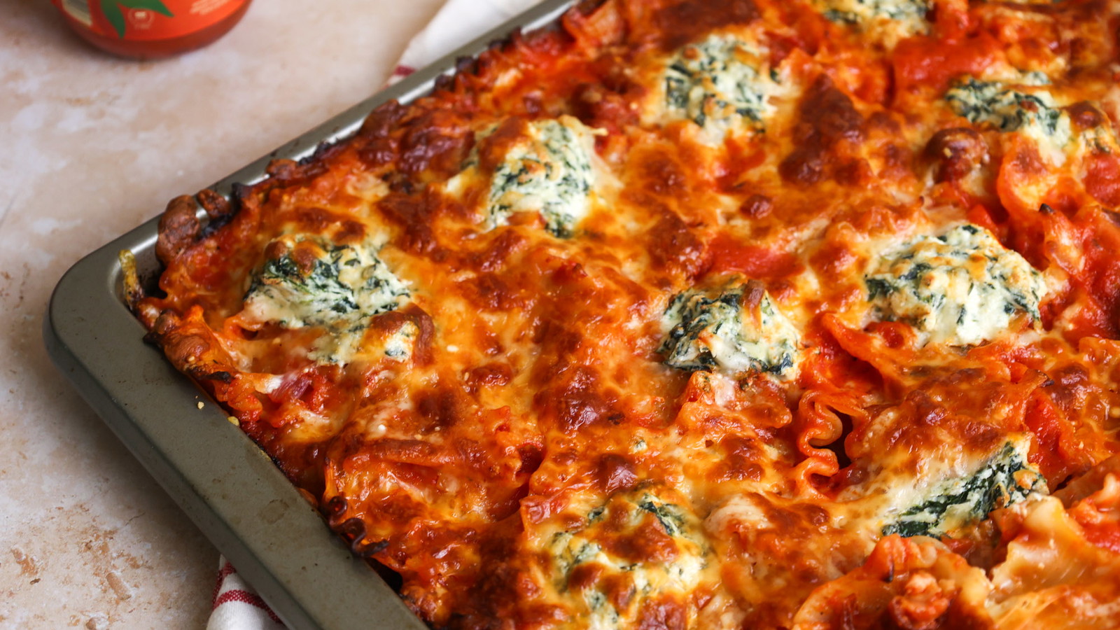 Transfer the pasta mixture to the prepared sheet pan. Dollop the ricotta-spinach mixture evenly across the top. Sprinkle with the remaining 1 ½ cups mozzarella and 1 cup Parmigiano.