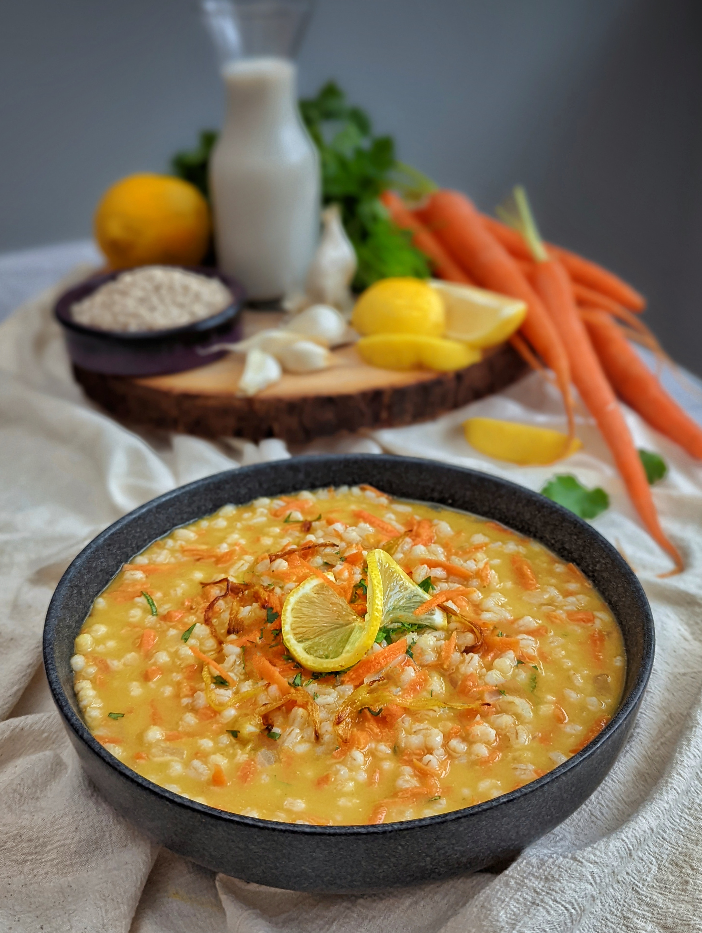 Add the minced garlic and sauté for a couple of minutes before adding the grated carrots, barley, chicken broth, salt, pepper, and lemon juice. Bring the pot to a gentle simmer, then reduce the heat, cover, and cook for about an hour. After an hour, check to ensure the barley is softened and fully cooked. Be careful not to overcook—the barley should have a slight bite to it, which gives this dish its satisfying texture.