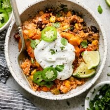 This family-friendly Southwest Chicken Quinoa Casserole comes together quick and is a complete meal when served with your favorite toppings.