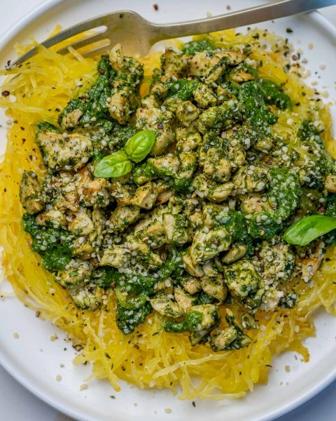 Divide squash evenly between plates and top with your chicken and pesto mixture.