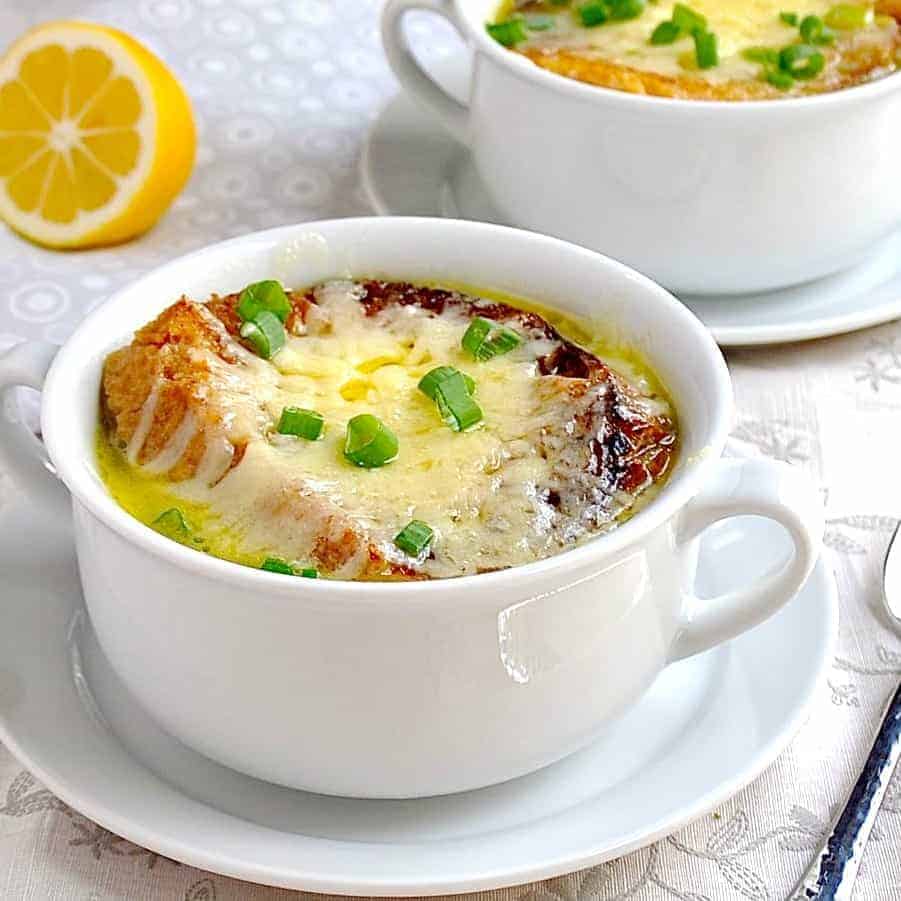 Spring Leek Soup is the perfect way to celebrate the tender leeks of spring! Think of this soup as the delicate cousin of French Onion soup. Both soups are topped with an oversized, melted cheese covered crouton, but instead of the deep, dark broth of French Onion soup, this leek soup has a light buttery broth and is prepared in a fraction of the time - 20 minutes from start to finish.