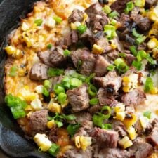 Steak and Corn Dip is the perfect appetizer! Grilled steak and corn with a cheesy mixture cooked to bubbly perfection.