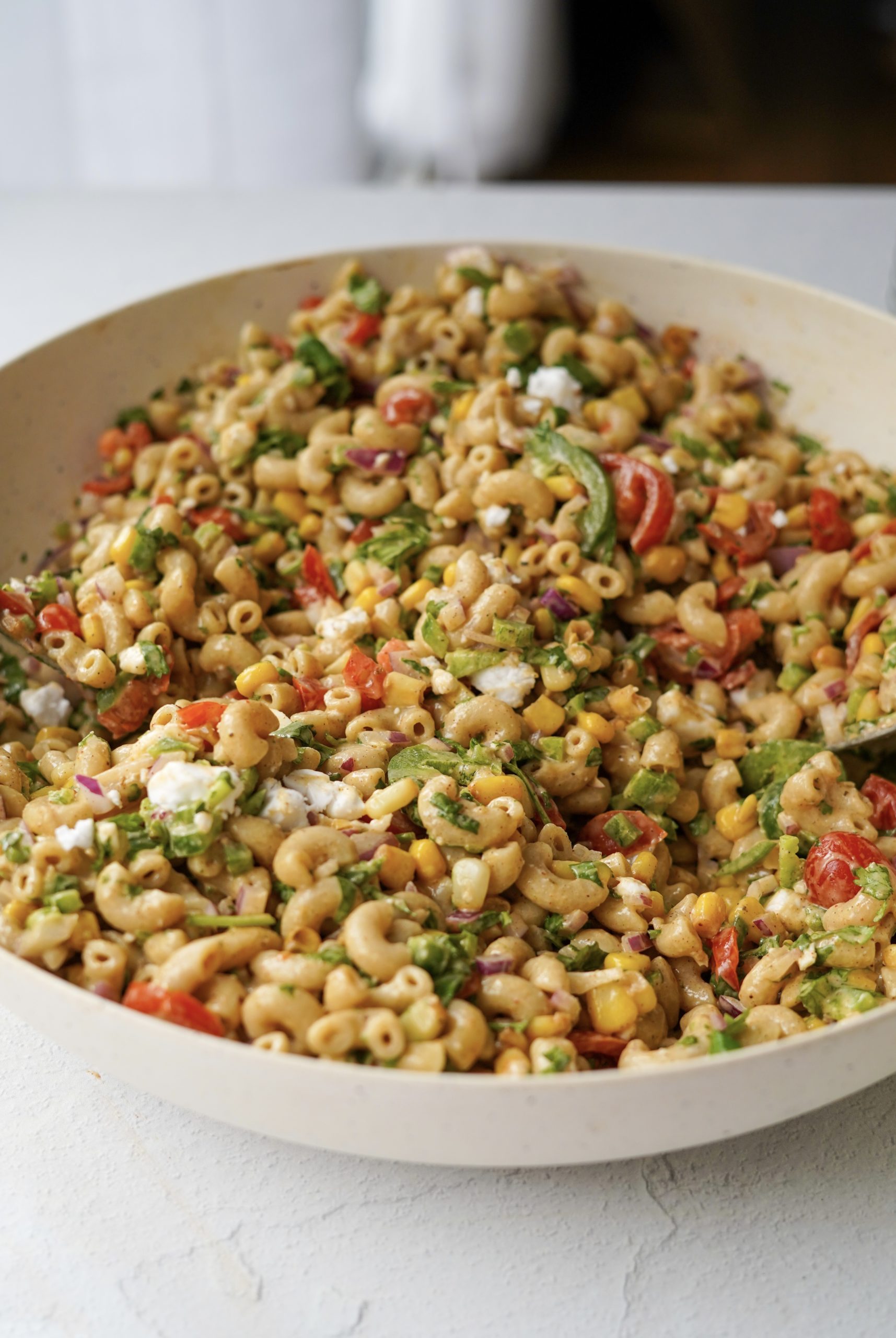 Meanwhile, combine the dressing ingredients in a small bowl or jar until smooth. Add macaroni to a mixing bowl, along with cooked corn, red onion, jalapeño, cilantro, and vegan feta.