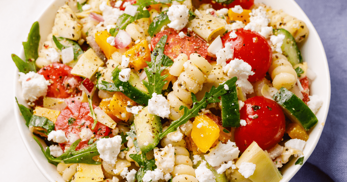 This summer pasta salad is the perfect side dish for warm summer days! Crisp, fresh veggies, tangy artichoke hearts, and salty feta are tossed with rotini and Italian dressing for a light, easy summer pasta salad.