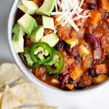 A hearty quinoa chili made with sweet potato, onion, bell peppers, zucchini, and beans.