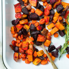 Clean and peel the carrots and chop into 1-inch chunks. Clean the sweet potatoes and chop into 1 inch chunks, leaving the skins on. Place the carrots and sweet potatoes in a bowl. Chop the beets into 1-inch chunks and place them in a second bowl (take care and wear an apron: the beets bleed when peeling and chopping them!).
