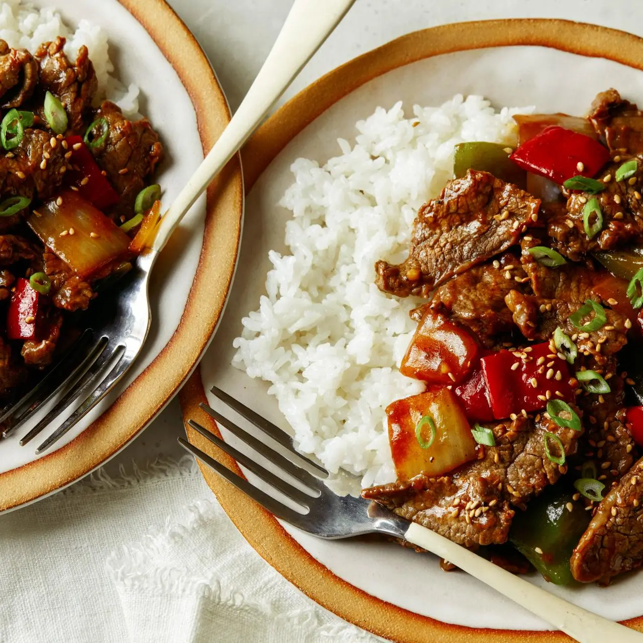 Return the steak to the skillet and stir to combine. Whisk the cornstarch into the sauce, then pour it into the skillet. Cook, stirring constantly, until the sauce is thick and glossy, about 2 minutes. Transfer the pepper steak to a large serving platter and top with sliced scallions and toasted sesame seeds. Serve immediately with a side of steamed rice.