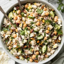 In a large bowl, combine the cooked quinoa, cooked chicken, chickpeas, cucumber, red onion, fresh parsley, fresh mint, pistachios, and feta; toss to mix the ingredients.