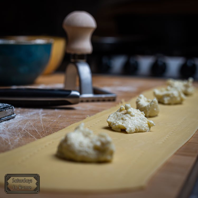 Using a tablespoon for an even amount, add a spoonful of the cheese filling to the pasta with enough space between the drops to keep the ravioli separate.